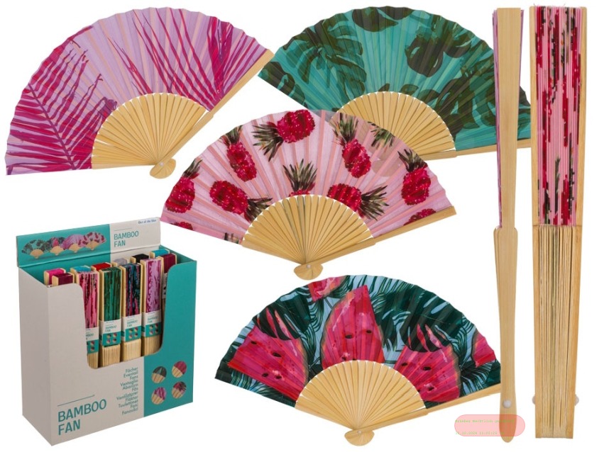 - Bambus-Fächer Tropical, ca.21cm, mehrfach gemischte Motive, Display - VE 24