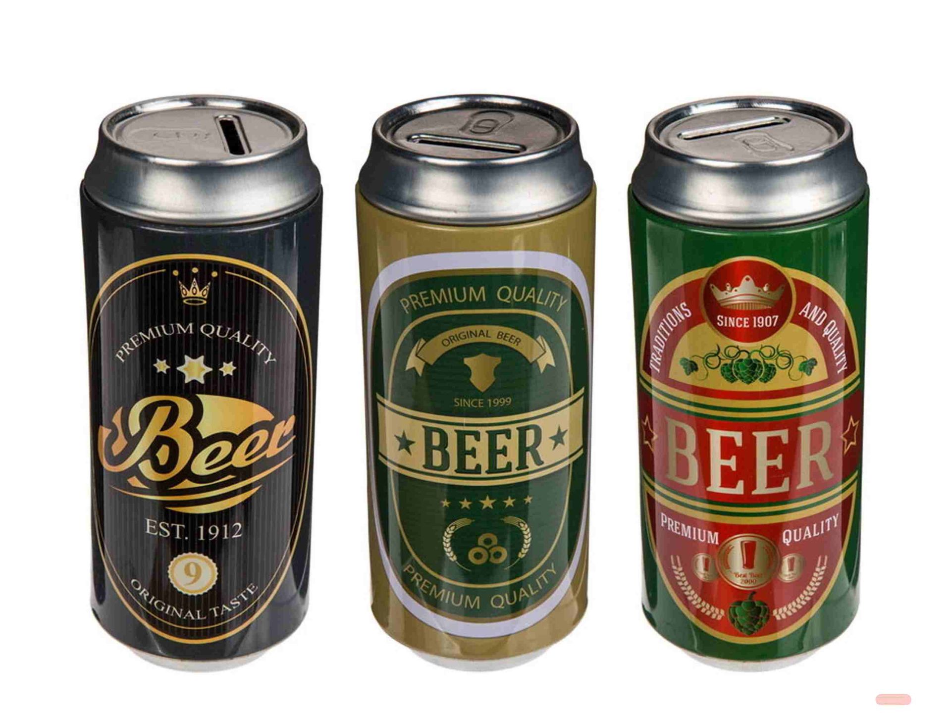- Bierdose Retro Spardose aus Metall, ca.16x7cm, 3-fach ass. - VE 12