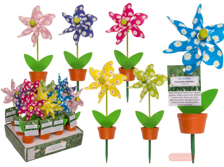 - Bunte Windmühle auf Holzstab im Topf, ca.20cm, 6-fach gemischt im Display - VE 12
