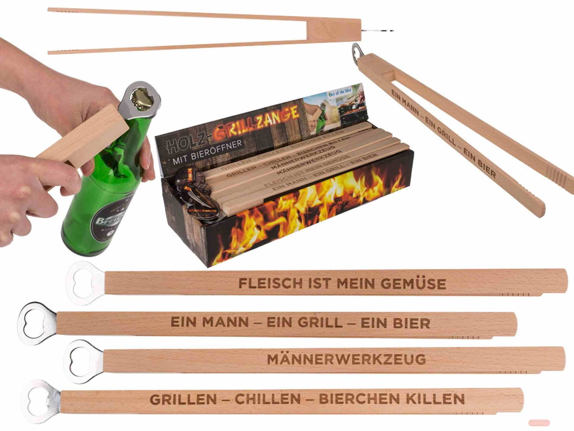- Flaschenöffner Grillzange Holz/Metall, ca.43cm, 4 diverse Sprüche, Display - VE 12