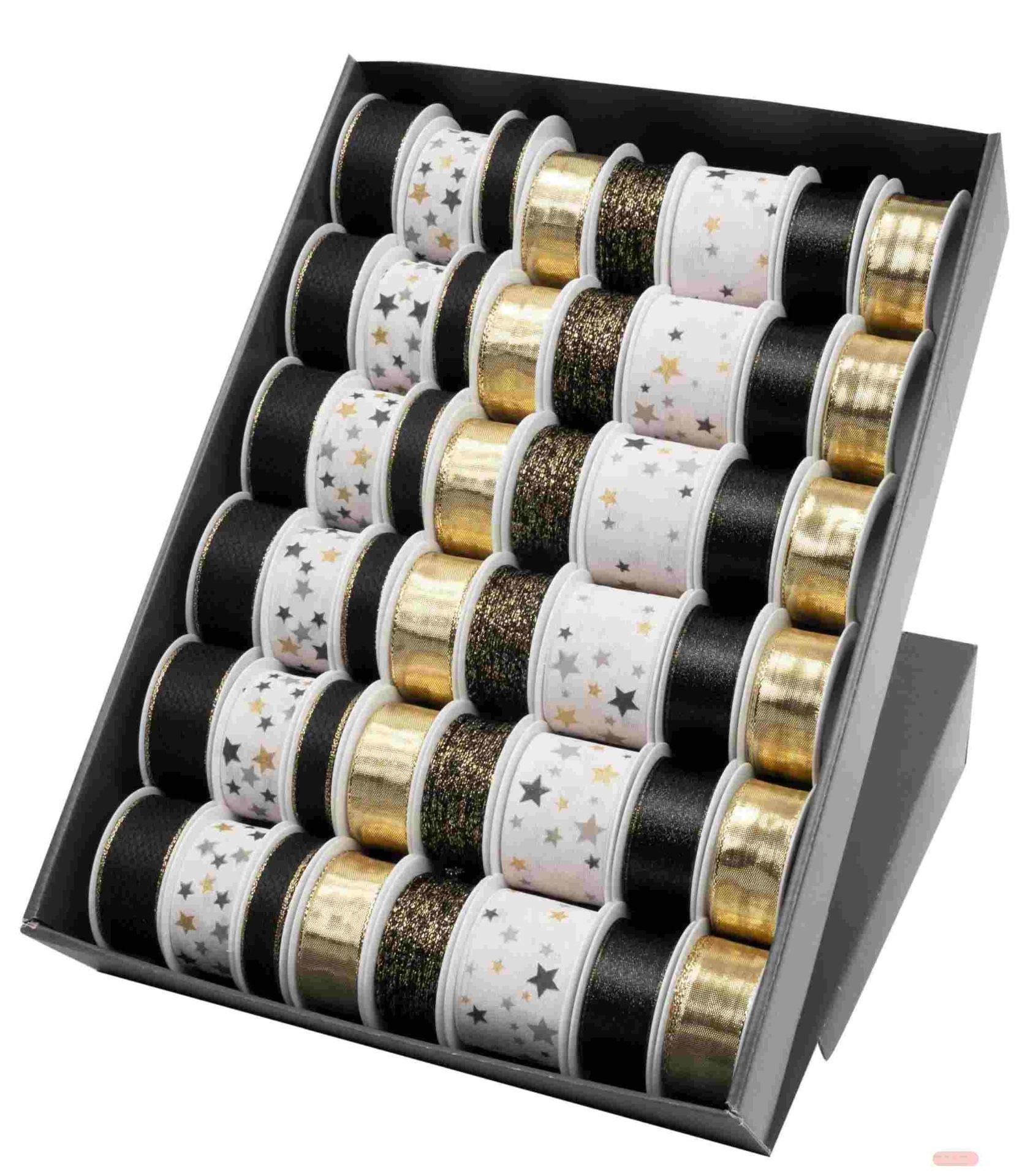 - Geschenkband, z.T. mit Drahtkante, div. Breiten/Längen, sw/w/gold gemischt - VE 48 (SR)