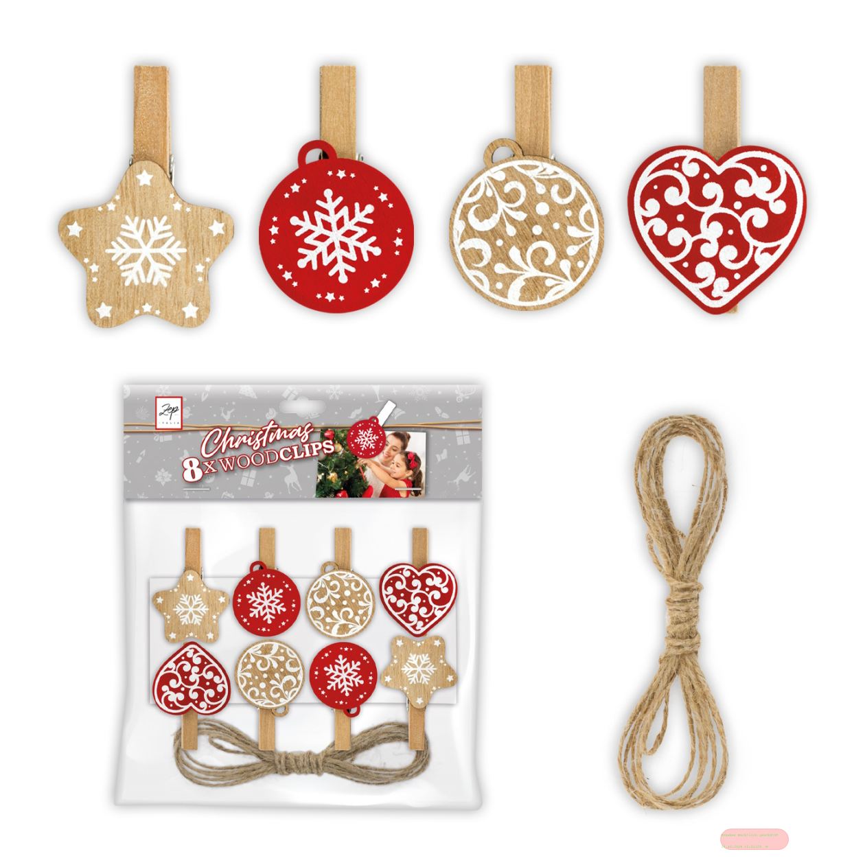 - Holzclips 8er Set mit 2m Schnur, Kit Wood Clips White, LK40W, Beutel Headercard - VE 3