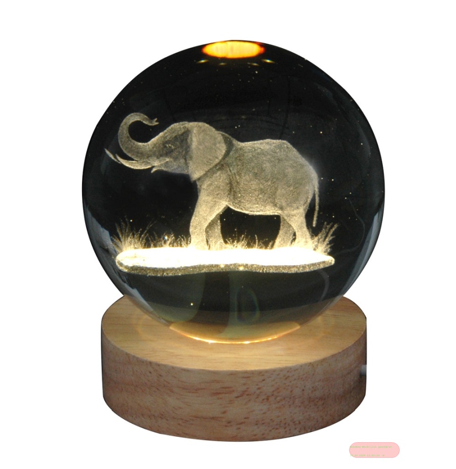 - Klarglaskugel, ca.8cm, LED-Holzsockel mit USB, eingelasertes Motiv Elephant