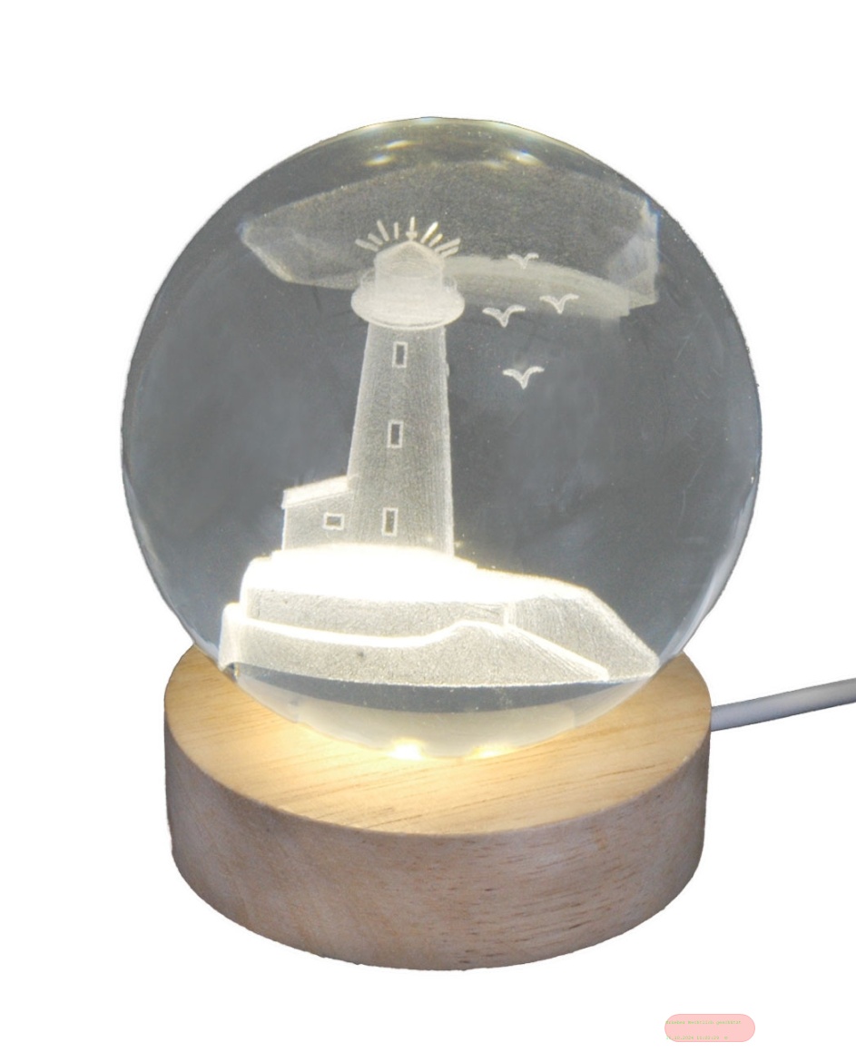 - Klarglaskugel, ca.8cm, LED-Holzsockel mit USB, eingelasertes Motiv Leuchtturm