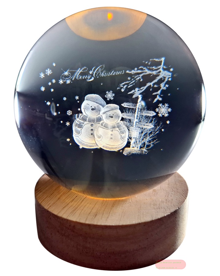 - Klarglaskugel, ca.8cm, LED-Holzsockel mit USB, eingelasertes Motiv Schneemänner