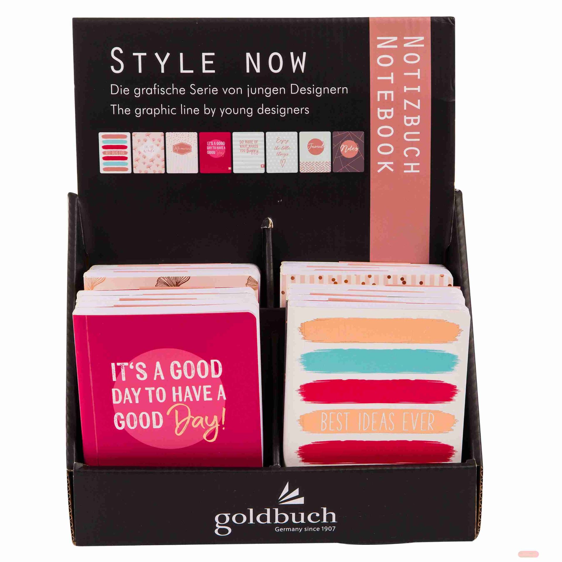 - Notizbuch DIN A6, 192 S. weiss, Style now, 8-fach ass. im Display - VE 16