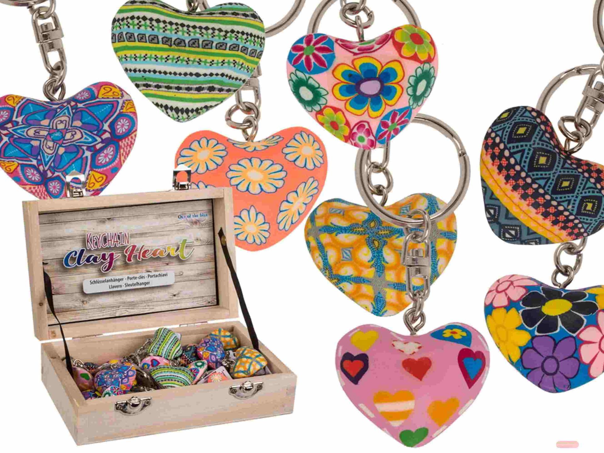 - Schlüsselanhänger Clay Heart aus Modeliermasse, ca.4cm, mehrfach ass. in Holzkiste - VE 24