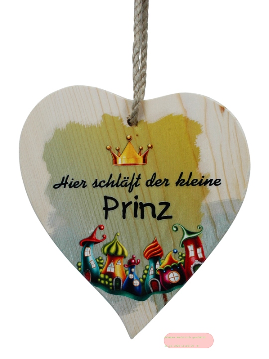 - Spruchherz Holz mittel, 15x17cm, Fichte 15mm mit Kordel, schläft der kleine Prinz - VE 4