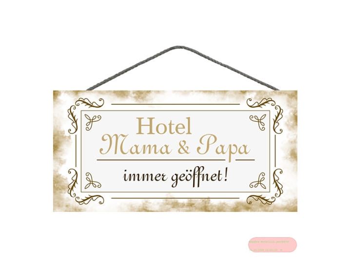 - Spruchschild 25x12,5cm, Sperrholz 8mm mit Kordel, Hotel Mama & Papa - VE 3