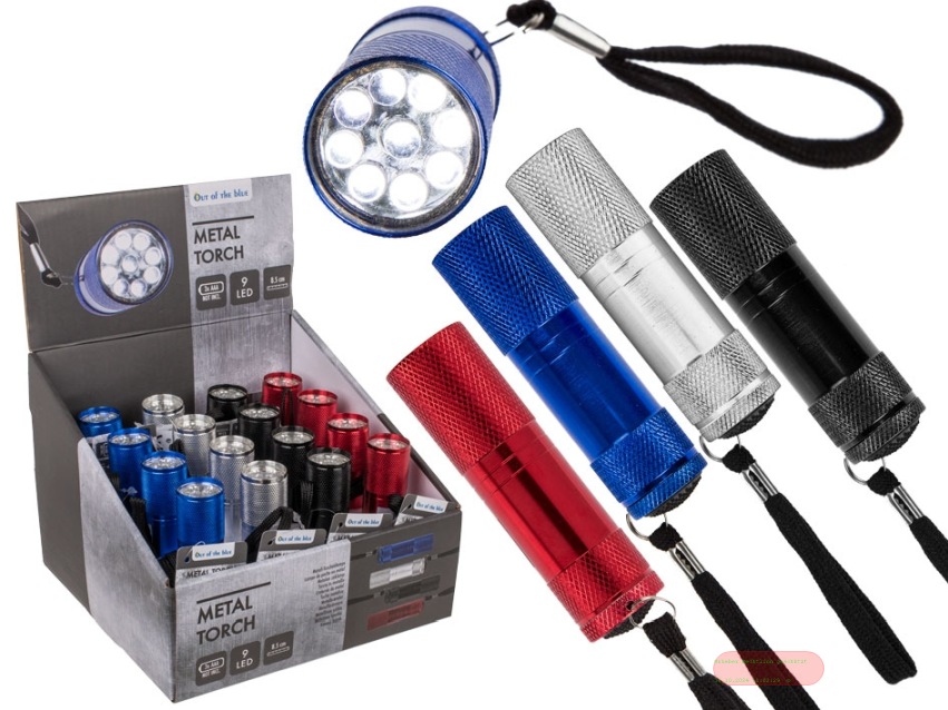 - Taschenlampe aus Metall, 9 LED, batt.betrieben, 8,5cm, 4-fach ass. im Display - VE 16