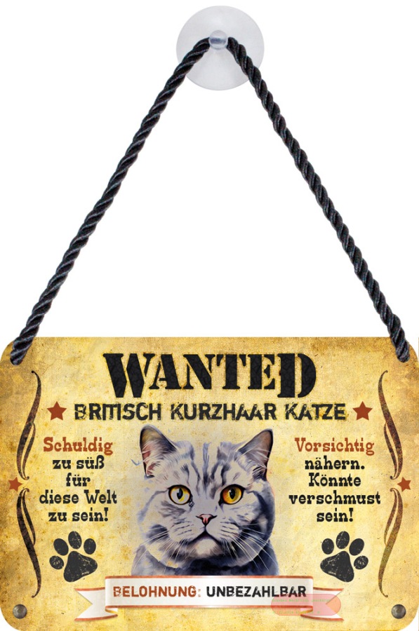 - Wanted Haustierschilder, 16,5x11,5cm, Blechschild 3D, Britische Kurzhaar Katze - VE 3